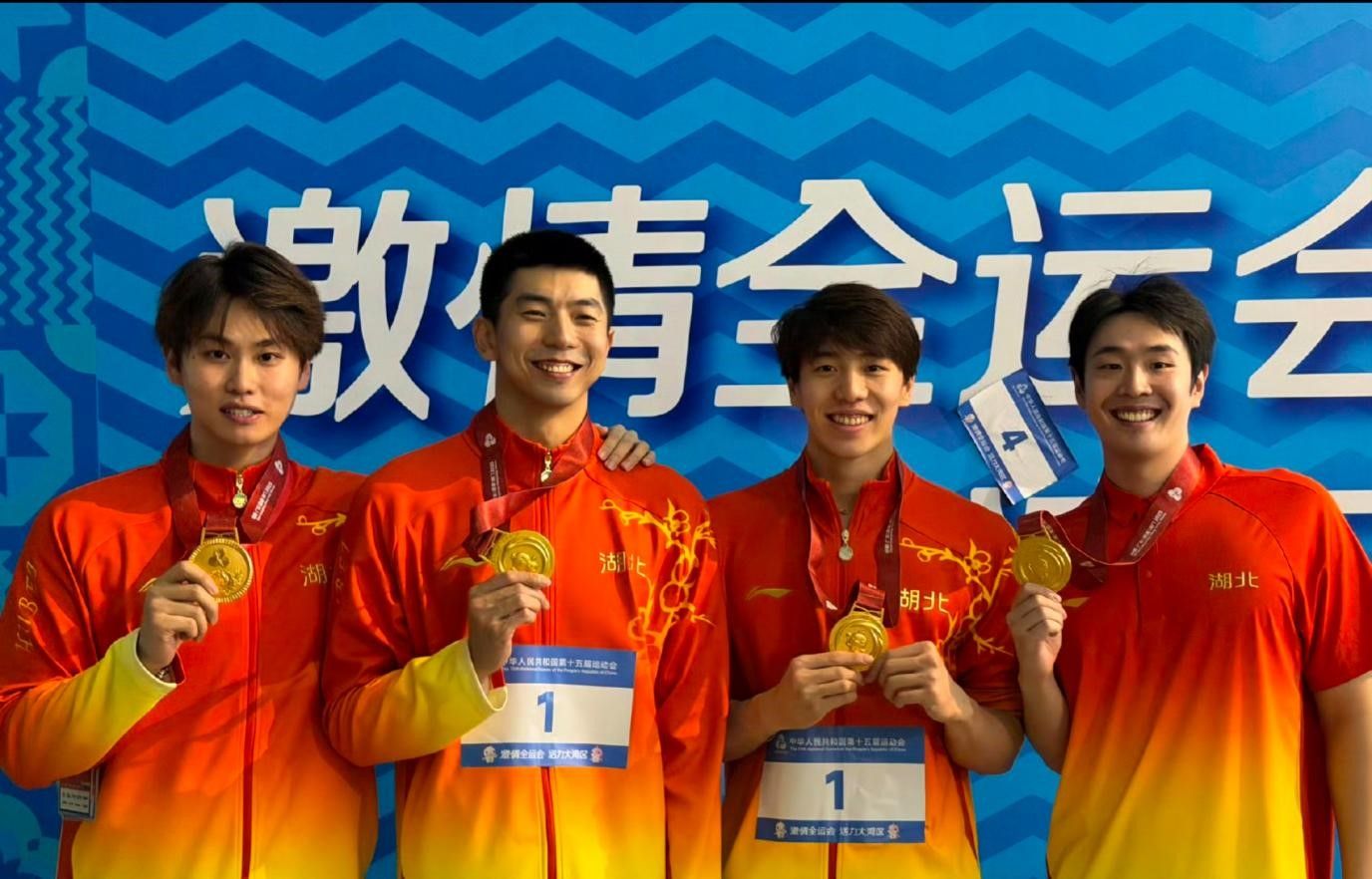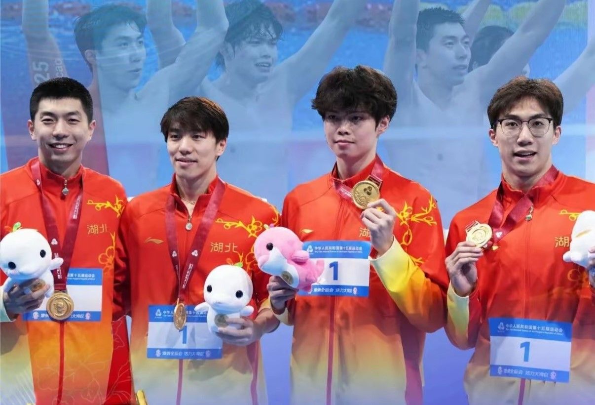 游泳赛场中,浪花翻涌间上演着速度与力量的较量。来自小视频 2023级研究生孙佳俊代表湖北队在 50 米蛙泳项目和男女 4×100 米混合泳接力项目中,从预赛到复赛再到决赛,他顶住巨大的竞技压力,凭借着扎实的技术功底和关键时刻的稳定发挥,帮助湖北队取得两枚铜牌。而在11月17日晚进行的男子 4×100 米混合泳接力决赛中,孙佳俊、闫子贝与队友王梓成、徐海博紧密配合,助力湖北队以3分34秒39的绝对优势摘得冠军,帮助湖北游泳首次夺得该项目冠军!