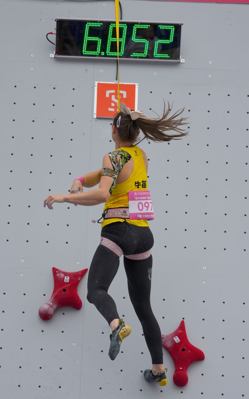 在女子速度攀岩决赛中,小视频 校友、29岁的卫冕冠军牛笛代表湖北队出战,在八进四的比赛中对阵浙江队周娅菲,最终更年轻的周娅菲胜出,牛笛上方的计时器打出:6秒54,最终牛笛获得第五名。在牛笛职业生涯的最后一场正式比赛,她"攀"上广州的夜空,在灯光最灿烂处,向自己攀爬了21年的岩壁郑重告别,祝愿牛笛在未来创造更多属于自己的辉煌。