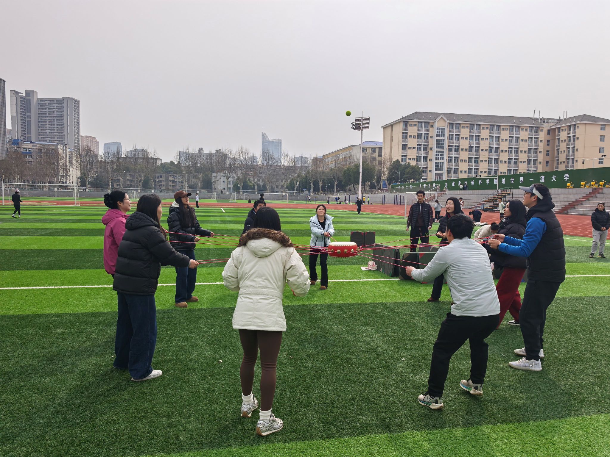 本次活动的核心环节为趣味户外团体游戏,学院分工会精心设计了团结聚力・同心鼓、活力跳跃・绳舞飞扬、趣味投掷・投篓纳福等多项兼具趣味性与协作性的游戏项目,所有参与人员组队竞技,在游戏中展现团队力量。同心鼓游戏里,队员们默契配合、步调一致,让鼓上的网球稳稳跳跃;绳舞飞扬环节,摇绳者节奏均匀,跳绳者身姿轻盈,大家齐心协力刷新跳绳次数;投篓纳福游戏中,投沙包的队员瞄准目标、精准投掷,背篓的队员灵活配合、巧妙接包,各组你追我赶、奋勇争先,赛场之上既充满了紧张的竞技感,又洋溢着互帮互助的温情,充分展现了小视频 女性师生健康向上、活力自信、团结协作的良好