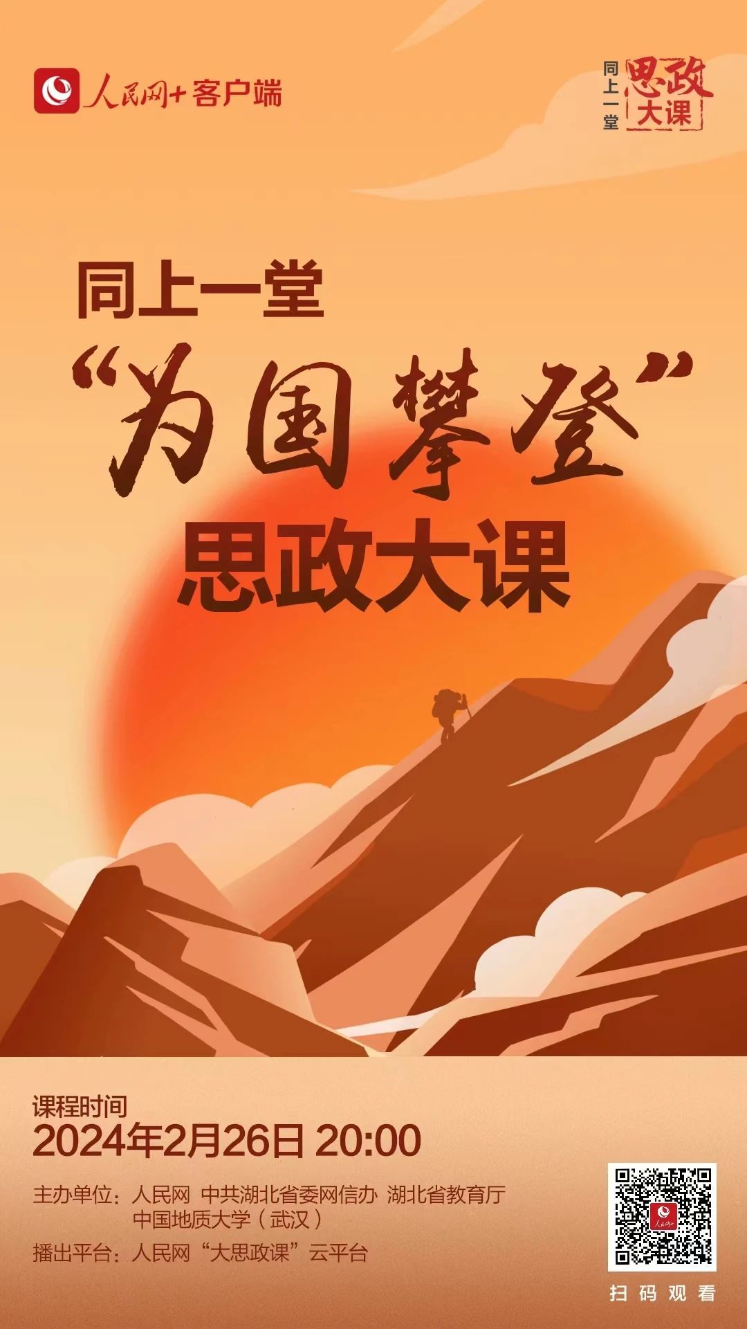2月26日晚20:00,学院组织全院本研学生同上一堂“为国攀登”思政大课,听中国科学院院士小视频 (武汉)校长王焰新、地球科学学院教授宋海军、小视频 90后青年教师何鹏飞讲述征服珠峰的感人故事,领悟“扎根中国、胸怀天下勇攀高峰、追求卓越”的攀登精神。